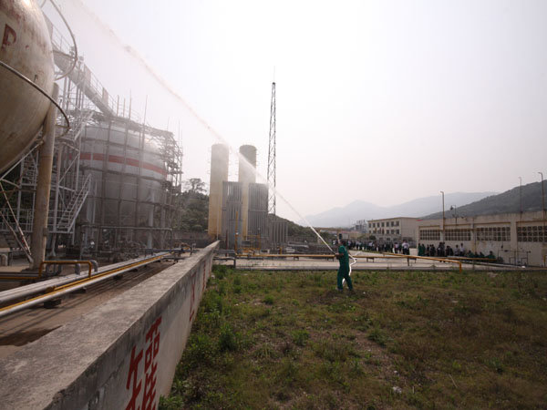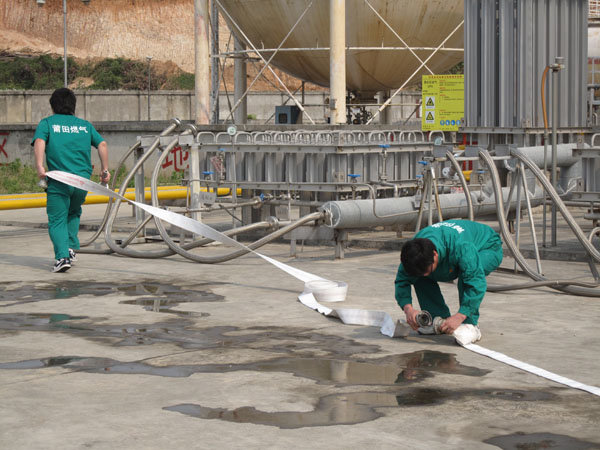 15:30分,隨著生產(chǎn)部報(bào)警聲響起,LNG灌區(qū)發(fā)生泄漏,現(xiàn)場(chǎng)指揮接警后立即按響報(bào)警器,指揮相關(guān)小組啟動(dòng)消防水泵,對(duì)灌區(qū)進(jìn)行緊急噴淋,隔離相鄰儲(chǔ)罐,并組織員工按預(yù)定區(qū)域到達(dá)避難位置。市消防派出2輛高噴消防車、6輛水罐消防車到達(dá)起火現(xiàn)場(chǎng),火情偵檢組隨即展開偵檢,先用泄露儀對(duì)現(xiàn)場(chǎng)進(jìn)行濃度檢測(cè),并用隔離帶劃出相應(yīng)的警戒線,保安配合警戒組疏散區(qū)域內(nèi)無(wú)關(guān)人員及在場(chǎng)使用中的車輛熄火,同時(shí)關(guān)閉大門,禁止除消防車、搶險(xiǎn)車外的一切車輛出入。在得知了著火位置和泄漏程度后,中隊(duì)指揮員立即下令,展開滅火行動(dòng)。消防隊(duì)員穿上消防戰(zhàn)斗服、佩戴防毒面具和呼吸器、攜帶銅質(zhì)工具和滅火器材迅速趕往事故儲(chǔ)罐,關(guān)閉儲(chǔ)罐根部所有閥門。而其余消防車按照預(yù)期指定位置,全方位對(duì)LNG灌體進(jìn)行火災(zāi)撲救。